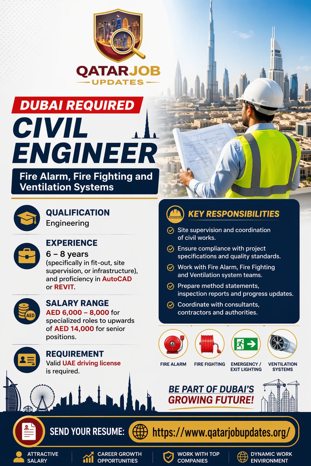 A well-established MEP and fire protection contracting company based in Dubai, UAE is currently seeking a skilled and experienced Civil Engineer to join their growing team. This role is specifically focused on fire alarm systems, fire fighting and suppression systems, emergency lighting, and mechanical ventilation projects โ all of which are central to building safety compliance across Dubai’s booming construction landscape.