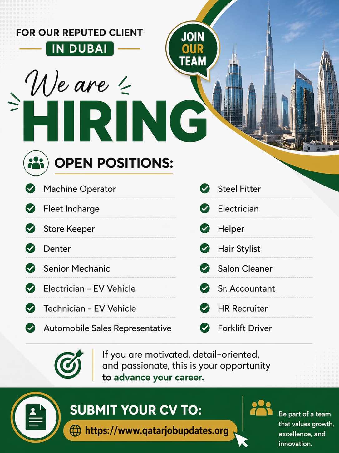 We are actively recruiting skilled and motivated professionals across multiple disciplines for our reputed client based in Dubai, UAE. Whether you are an experienced technician, a finance professional, or a customer-facing specialist, there is a role for you.