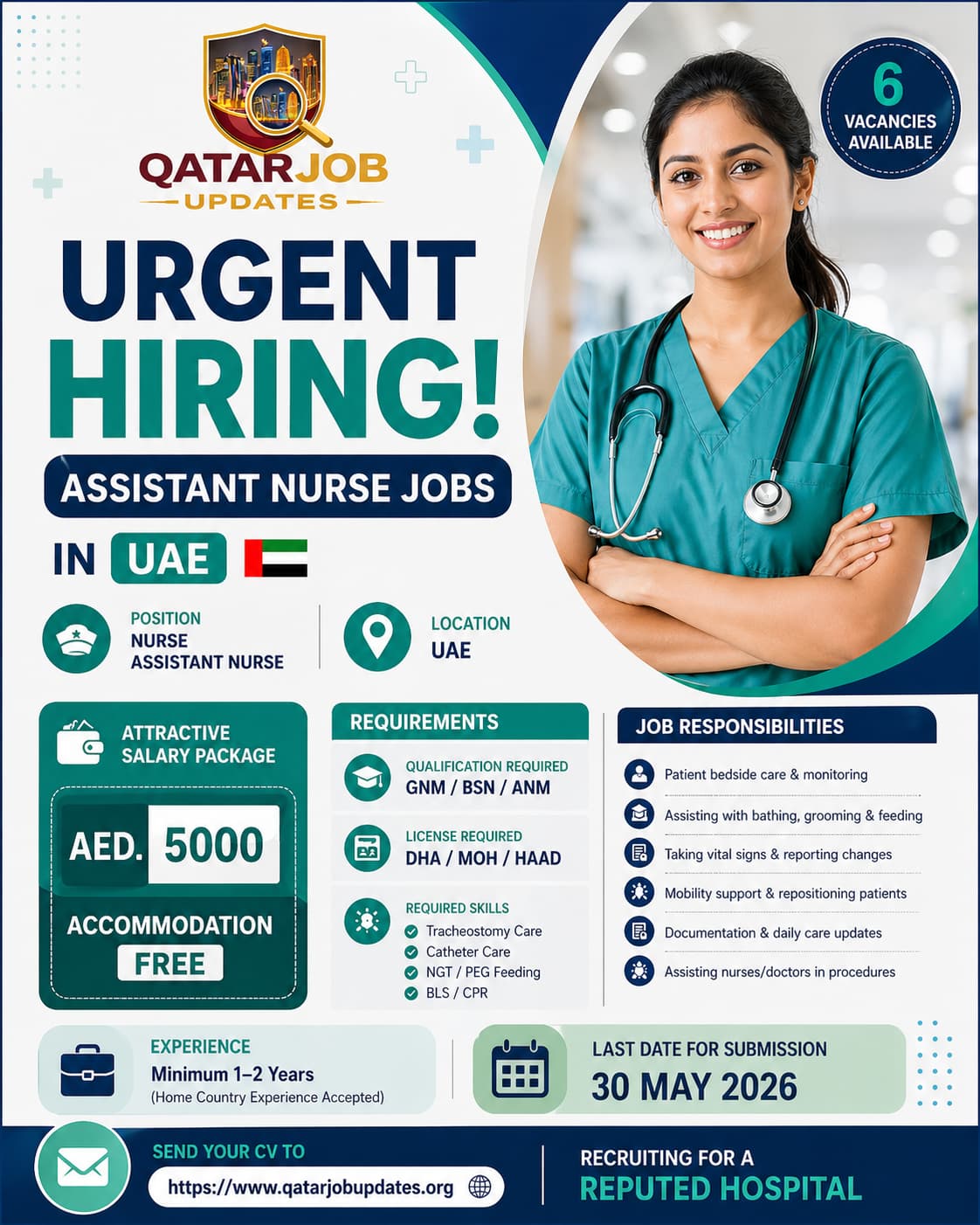 Qatar Job Updates is proud to present an urgent recruitment opportunity for qualified and compassionate nursing professionals seeking to build a rewarding career in the United Arab Emirates. A leading, well-established hospital in the UAE is currently inviting applications from motivated and skilled candidates to fill 6 open vacancies for the position of Nurse / Assistant Nurse. This is a full-time, hospital-based role offering an attractive compensation package with free accommodation, making it an exceptional opportunity for dedicated healthcare workers ready to make a difference in patient lives across the UAE.