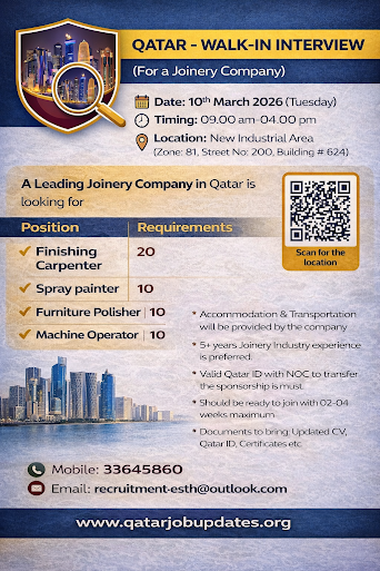 *Accommodation & Transportation will be provided by the company *5+ years Joinery Industry experience is preferred. *Valid Qatar ID with NOC to transfer the sponsorship is must. *Should be ready to join with 02-04 weeks maximum *Documents to bring: Updated CV, Qatar ID, Certificates etc
