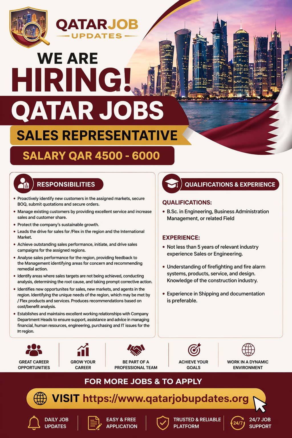 Qualified and interested candidates are encouraged to send their updated CV and a brief cover letter through the official Qatar Job Updates portal. Please ensure that your application clearly highlights your relevant experience in fire safety sales, your years of experience, and your current or expected salary. Only shortlisted candidates who meet the above qualifications will be contacted for the next stage of the selection process.