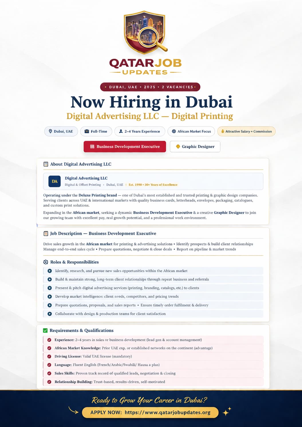 Currently expanding its presence in the African market, Digital Advertising LLC is seeking a dynamic Business Development Executive and a creative Graphic Designer to join its growing Dubai team. Both roles offer excellent remuneration, real growth potential, and the opportunity to work with an experienced, professional team at the heart of Dubai’s thriving print and advertising industry.