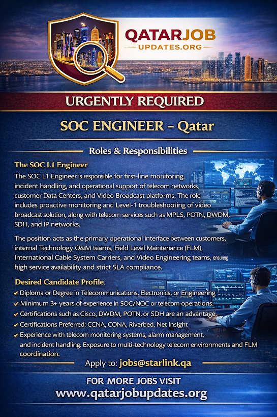 Keywords: Qatar jobs, Jobs in Qatar, Doha jobs, Qatar vacancies, Qatar hiring, Qatar careers, Gulf jobs, UAE jobs, Saudi Arabia jobs, Oman Jobs