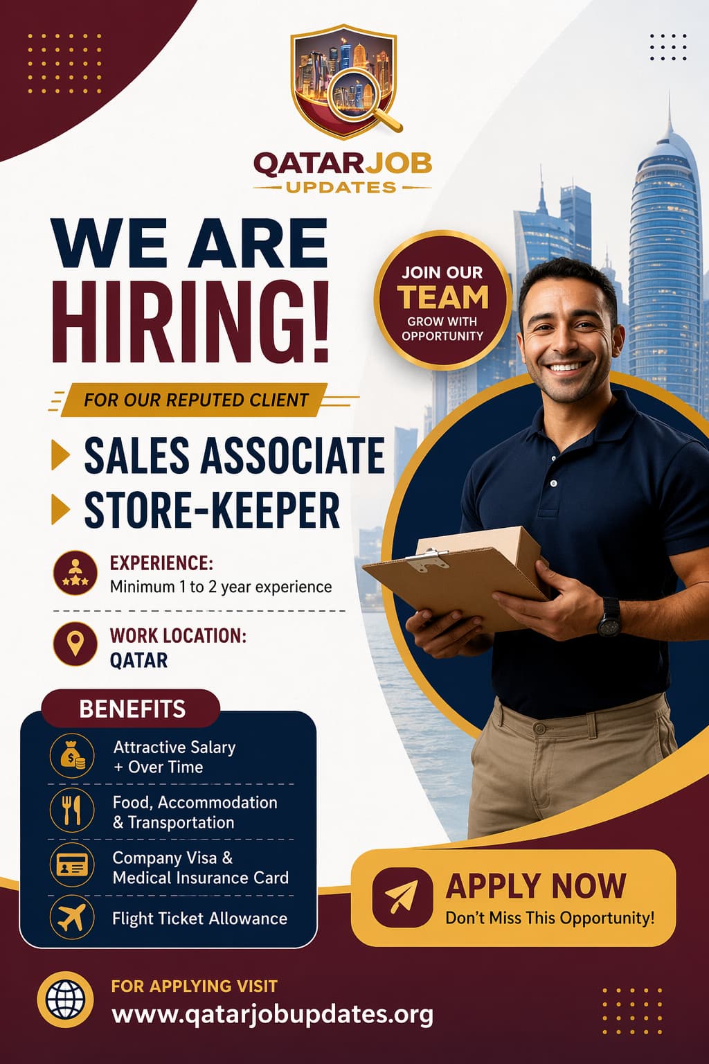 Qatar Job Updates is proud to announce an urgent hiring drive on behalf of a reputed client in Qatar. We are seeking motivated, reliable, and customer-focused individuals to join their growing team as a Sales Associate and Store-Keeper.